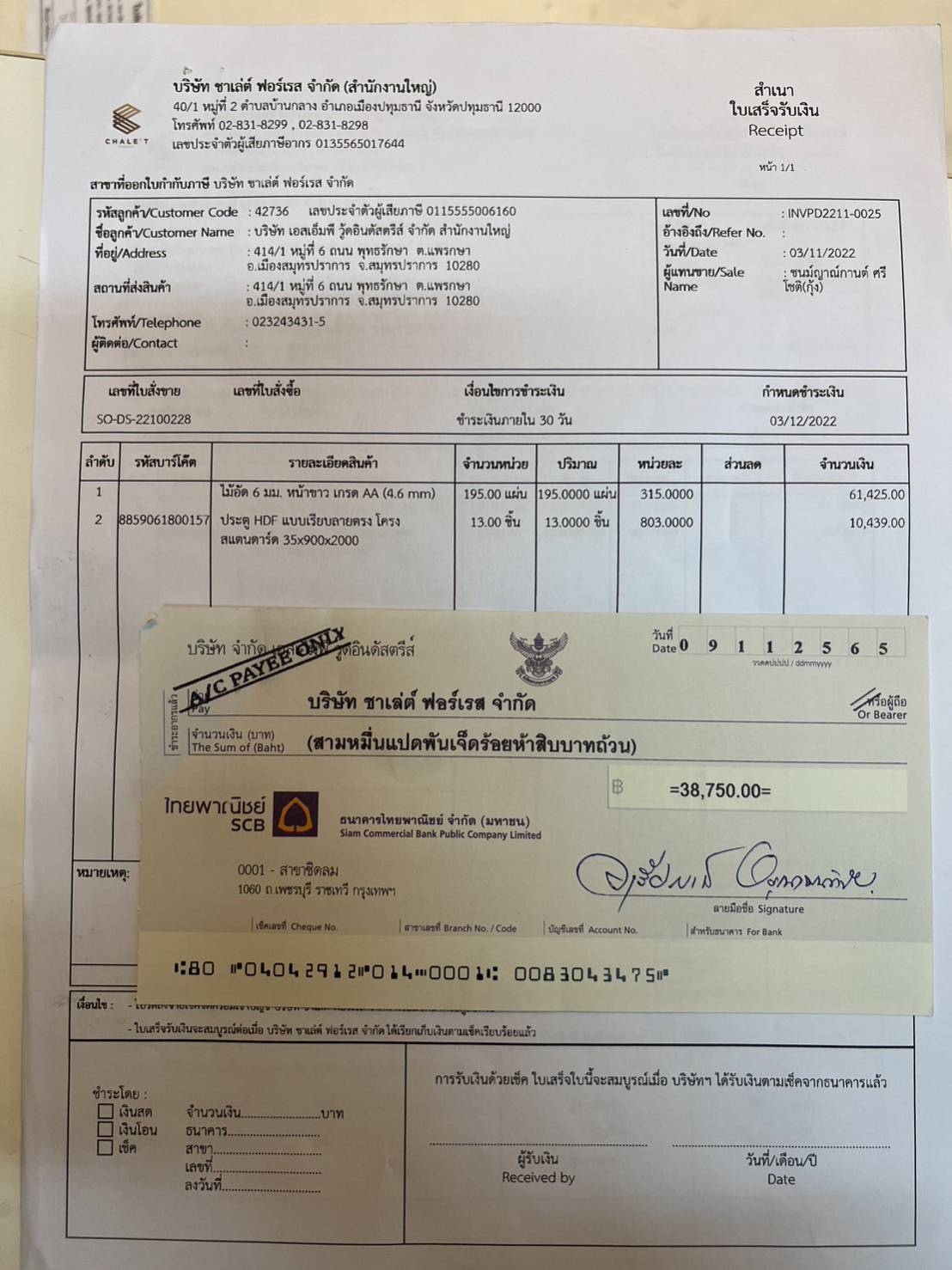 รับเช็ค บริษัท เอสเอ็มพี วู้ดอินดัสตรีส์ จำกัด สำนักงานใหญ่ ตัด INVPD2211-0126