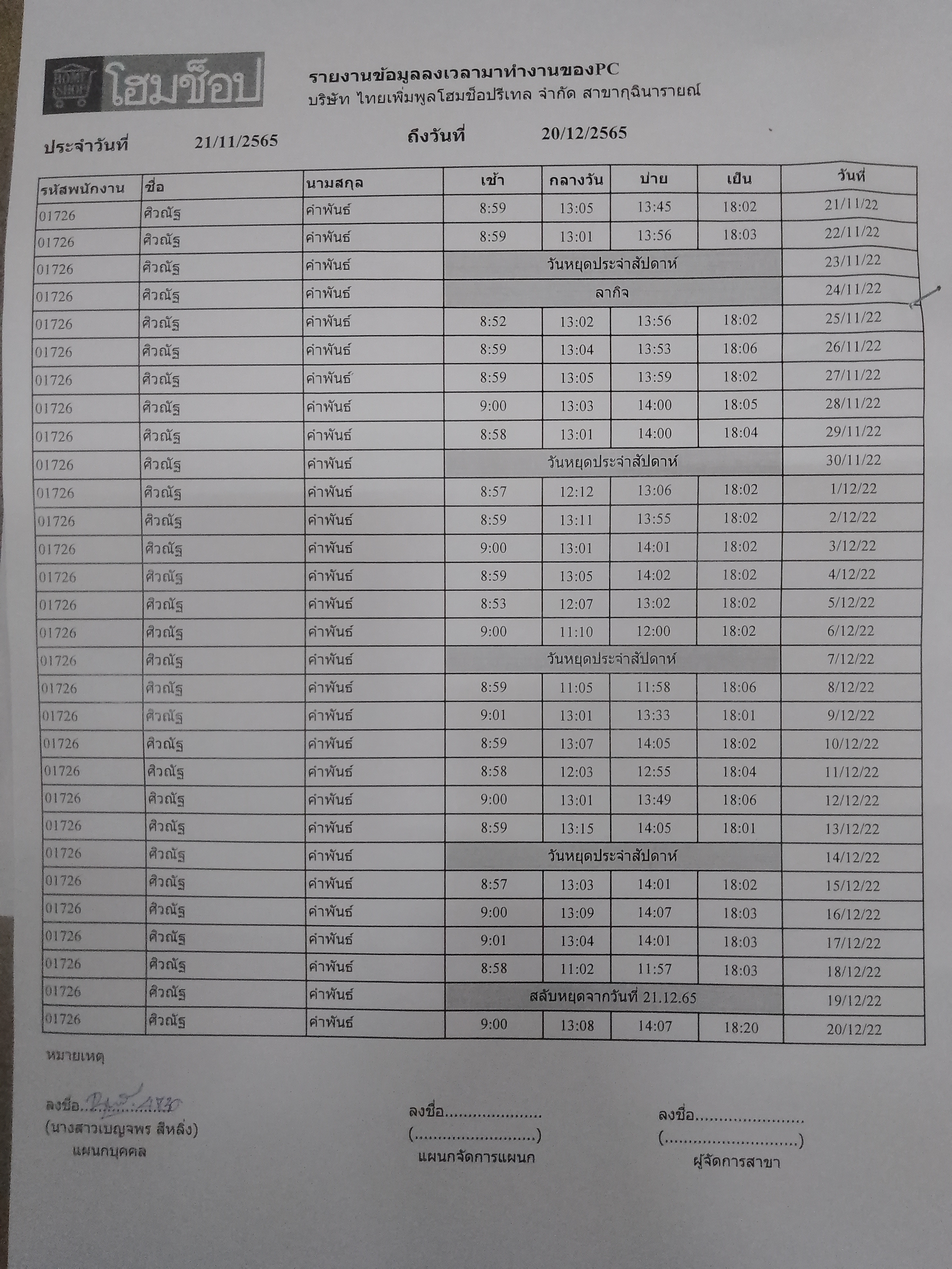 ใบลงเวลา ตั้งแต่วันที่ 21/11/65-20/12/65